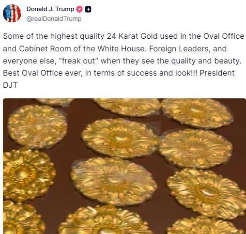 中国新闻服务,9月29日。据《纽约邮报》报道,当地时间第28届,美国总统在社交媒体上展示了椭圆形办公室的最新金珠宝,并声称看到外国领导人在看到它后“惊讶”。图片来源:美国总统特朗普在社交媒体上的帖子的屏幕截图写道:“椭圆形办公室和白宫内阁使用了最高质量的24k金牌。他还说:“这是历史上最好的椭圆形办公室! “报告指出,特朗普还附上了将近40秒的视频,其中显示了一系列的金装饰。一些美国人对特朗普的行动表达了不愉快的效果。在食物之后,农民需要帮助,有些人被枪杀了……特朗普对他的黄金收集吹嘘。一些美国网民也说是不好的,许多美国人都努力努力,而且没有什么比这更好地展现了豪华的金色装饰。”
